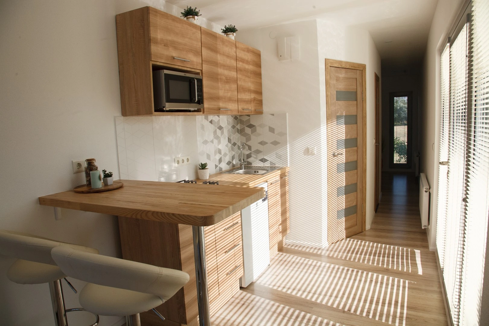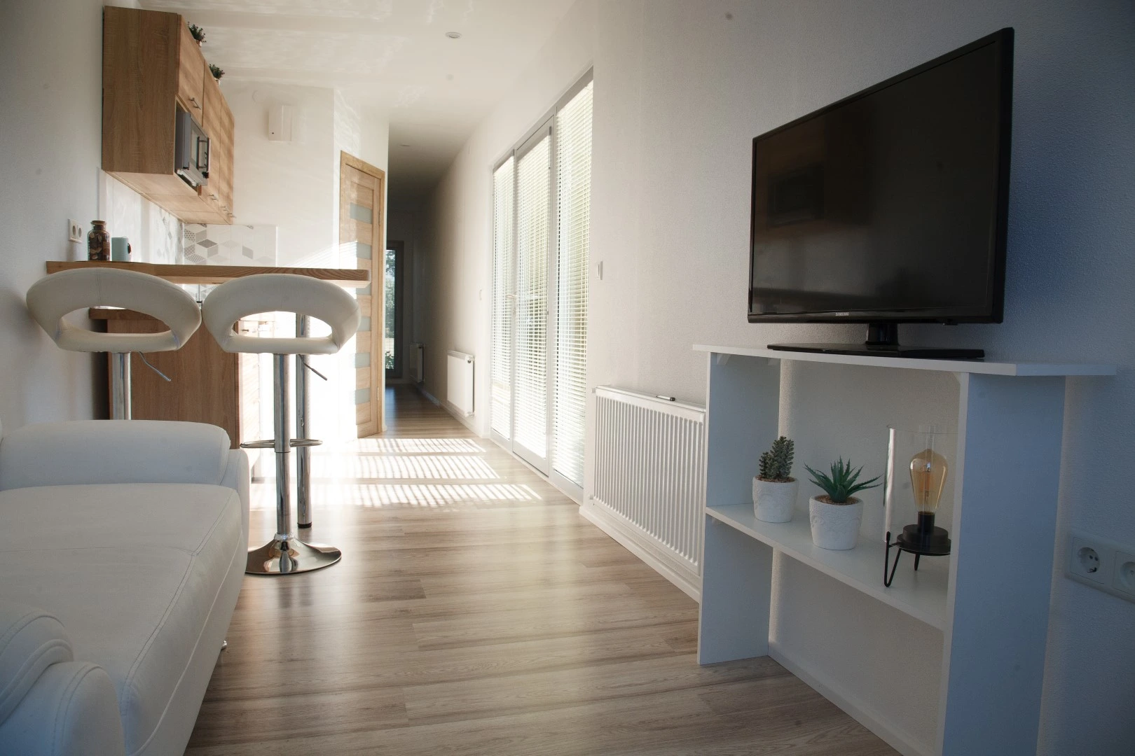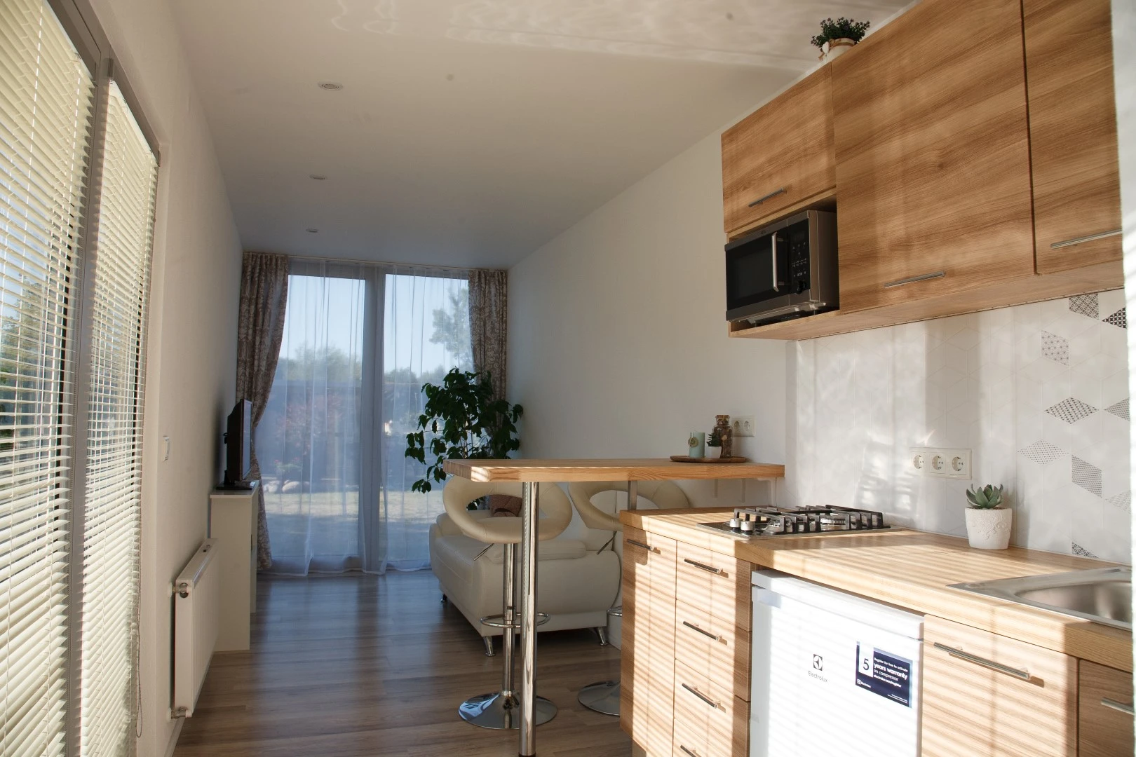 Well... we think that You could never imagine that this fully finished interior is in that conatiner house. But Yes, studio type living room with fully equiped kitchen, technical room, bathroom, hallway and bedroom and sauna unit. You can have it like it is!
